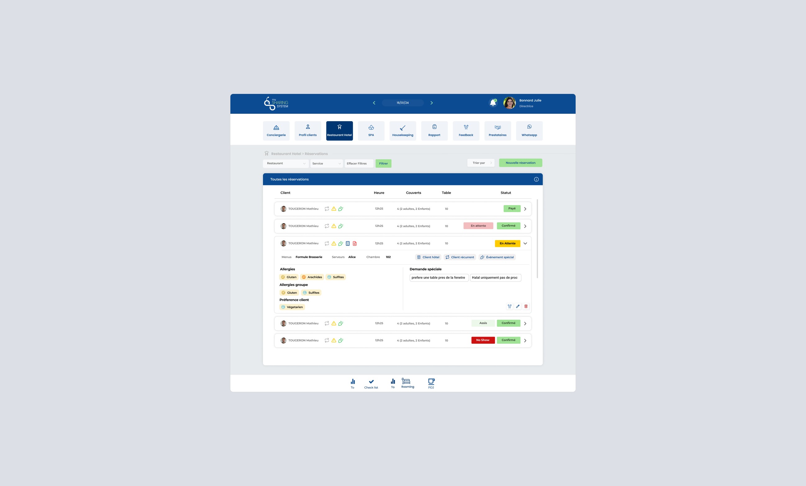 MySharingSystem centralizes reservations, availability, and team operations in a single web app. Teams can manage booking flows and calendar-based availability, track statuses and tags at a glance (confirmed, pending, cancelled; sick, paid leave, off, vacation), and keep guest context like allergies and special notes visible when it matters. Staff workflows are supported through request/absence management, shift timing (entry, break, exit), and operational tools such as tips distribution and petty-cash tracking so the front-of-house and back-office stay aligned in real time.