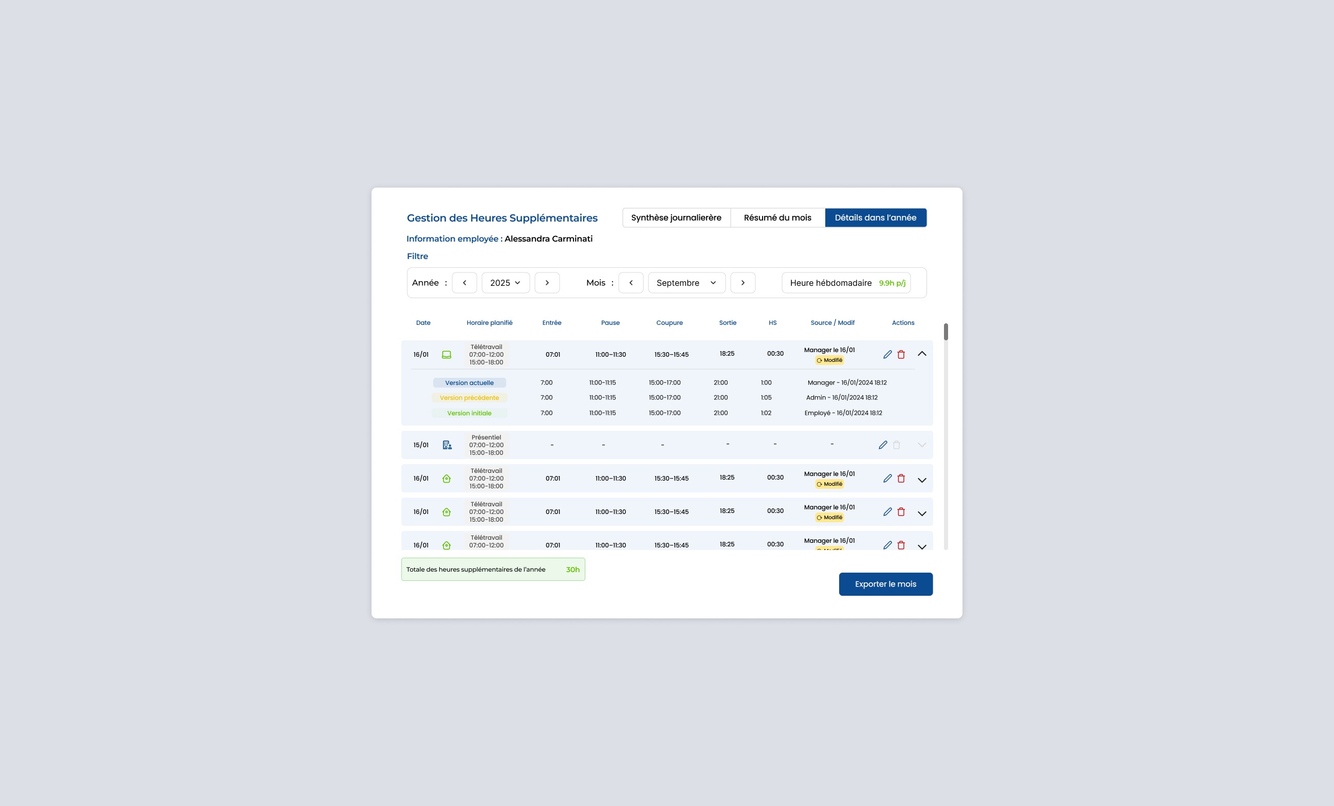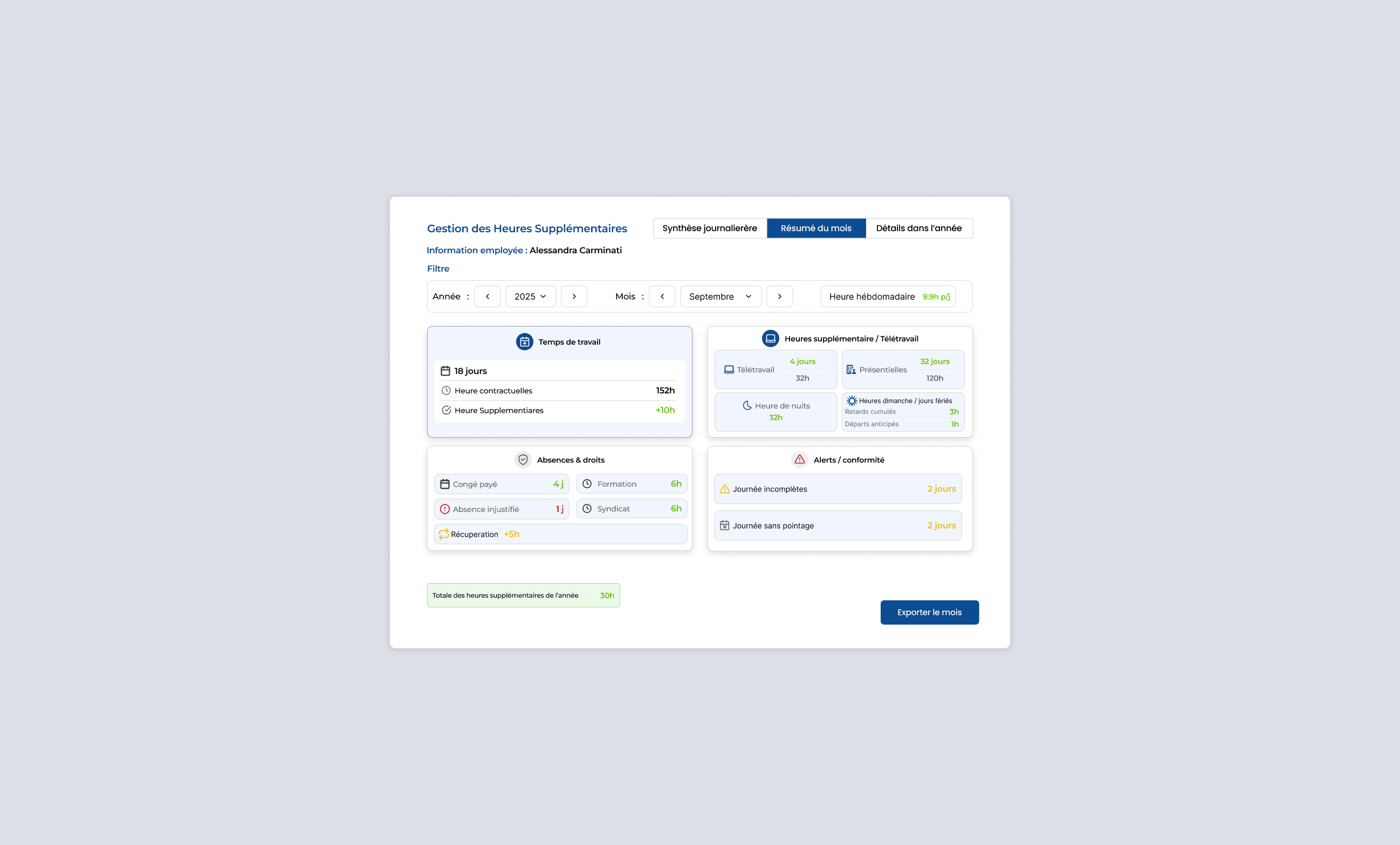 This project focuses on designing a clear, compliant, and manager-friendly interface for tracking employee working time, overtime, telework, and absences.